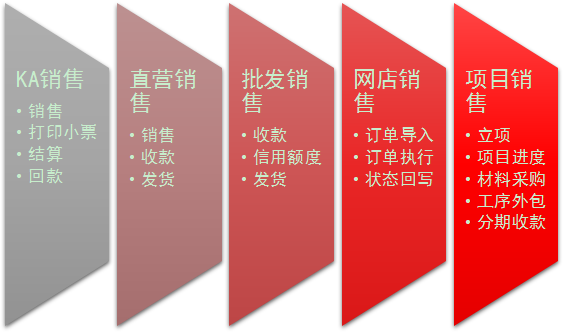 支持KA销售、直营销售、批发销售、网店销售、项目销售等模式,并实现销售过程中的各种业务控制。