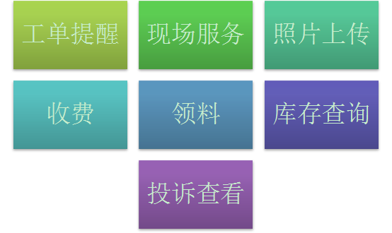 派工给服务人员的工单,会在手机端上实时提醒,服务人员在手机端上可以看到所有的待办工作,以及每个顾客的地址电话等信息,方便安排自己的工作和路线等。现场服务时通过手机端可以搜集很多信息,如输入处理的办法,使用的配件,收取的费用等,还可以拍摄现场产品照片上传到服务器中。服务人员在收到待办工单时,根据故障可以判断出需要领取哪些配件,可以提前在手机端上填好领料申请,库房人员按要求备货,可以省掉很多现场开单领料的时间,做更多的工作。