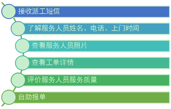 系统派工之后,会通过短信平台自动给顾客发送短信,短信中包含服务人员的姓名、电话、上门时间等,顾客收到短信后可直接联系服务人员,避免反复拨打呼叫中心电话。短信中带有工单链接,点击可直接打开查看工单详请。工单中有服务人员的姓名、电话、照片以及报修信息,在服务人员上门时通过照片比对确认,防止骗子借机上门行骗。在服务完成后,顾客可对服务人员评价,公司能够得到最真实的服务质量评价。顾客可以通过手机端自助申请服务,后台收到请求后立即安排服务人员上门服务。